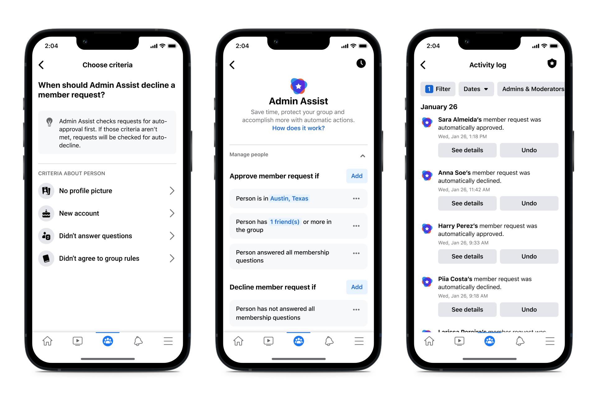 - Use Admin Assist to automatically approve or decline member requests, based on specific criteria they set up, including whether the prospective member has completed all member questions.