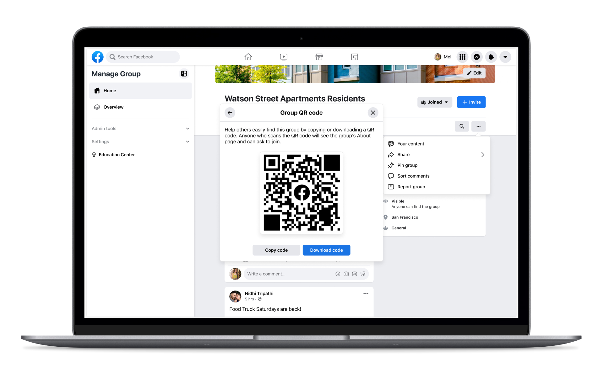 - To help make sharing groups and connecting with a specific community a more seamless experience, we’ve added QR codes which admins can download or copy and paste from the Share menu and share as they like. When scanned, people will be directed to the group’s About page where you can join or request to join.