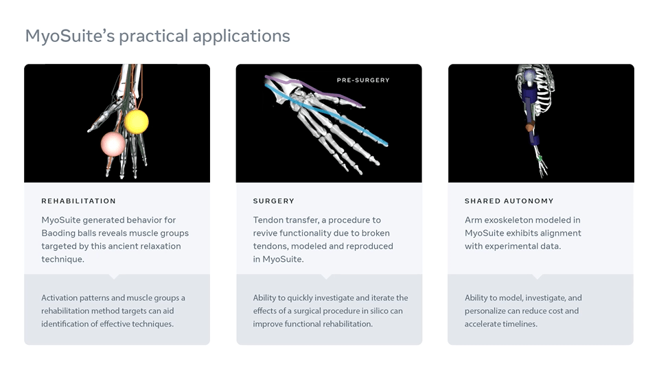 Let’s consider a tendon-tear injury. MyoSuite can easily model tendon-transfer, a well-known technique for recovering functionality due to a torn tendon. MyoSuite also has the ability to simulate the outcome, in terms of mobility, achieved by a given surgical procedure and the impact it will have on the functional rehabilitation of the affected parts, following the surgical procedure. The MyoSuite models can also help inform splint support designs and rehabilitation procedures by highlighting activation patterns and muscle groups.