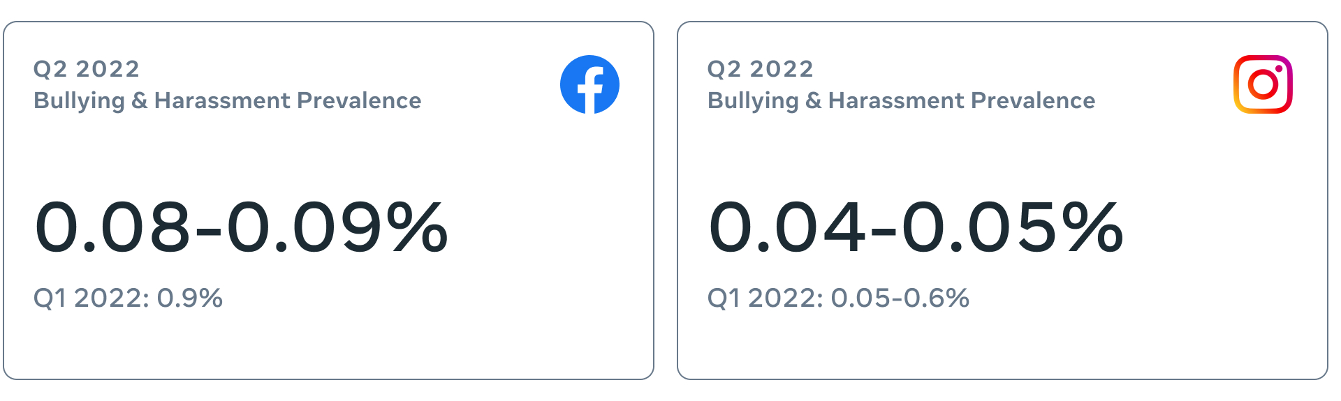 We continue to make steady progress on a number of areas, including bullying and harassment. As we continue to improve our AI technology, the proactive detection rate of bullying and harassment content on Facebook increased from 67% in Q1 2022 to 76.8% in Q2 2022 and on Instagram from 83.8% in Q1 2022 to 87.4% in Q2 2022.