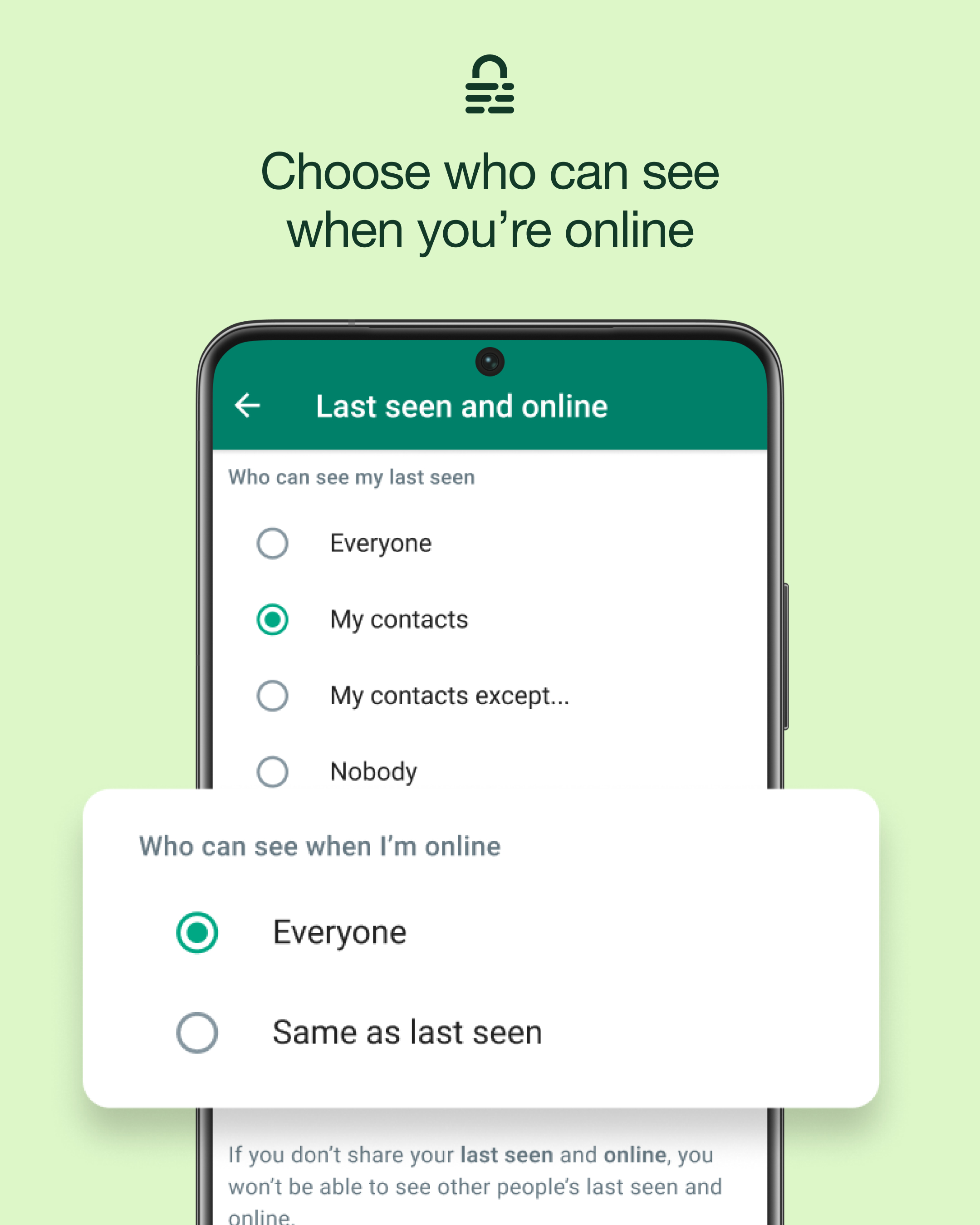 Seeing when friends or family are online helps us feel connected to one another, but we’ve all had times when we wanted to check our WhatsApp privately. For the moments you want to keep your online presence private, we’re introducing the ability to select who can and can’t see when you’re online. This will start rolling out to all users this month.