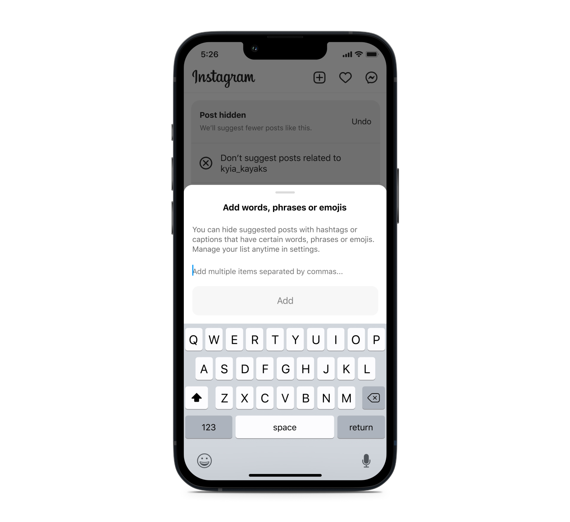 We’ll also soon start testing the ability to tell Instagram you don’t want to see suggested posts with certain words, phrases or emojis in the caption or hashtags. Whether you’re seeing something that’s not relevant, or have moved on from something you used to like, you can use this feature to stop seeing content that’s not interesting to you.