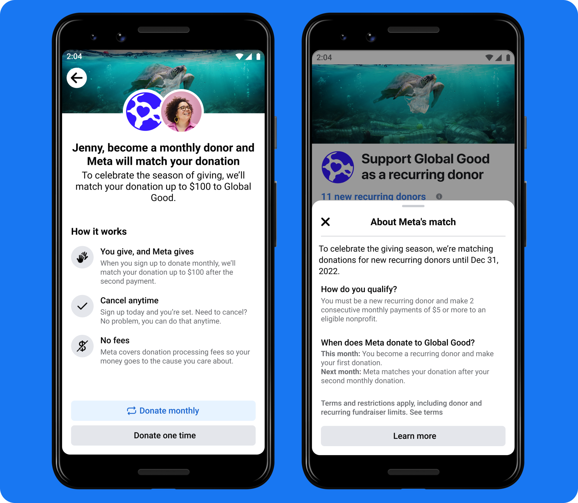 Today we’re announcing a new way of matching donations this giving season that helps organizations raise money long-term. When you sign up to donate monthly to a nonprofit on Facebook, Meta will match 100% of your donation after you make your second monthly donation. We’ll match up to $100 per donation, $100,000 per nonprofit and up to $7 million in total across all organizations. This is a shift from how we’ve historically matched one-time donations on GivingTuesday. As we celebrate the 10th anniversary of this global day of giving, we look forward to helping organizations sustain support far beyond the holidays.