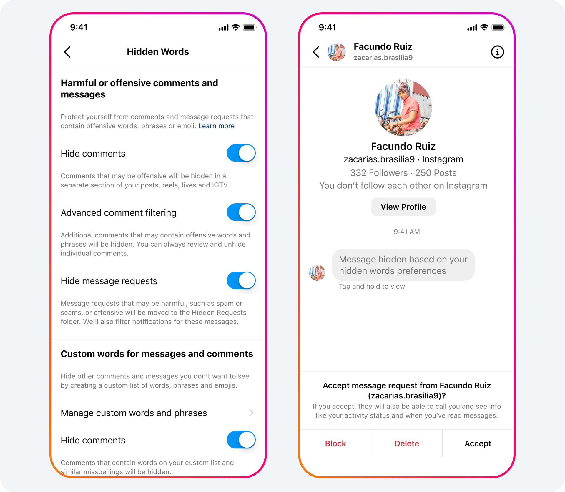 People can turn direct message (DM) requests off completely on Instagram, meaning they won’t receive messages from anyone they don’t follow. They can also choose who can comment on their posts or turn off comments altogether, on a post-by-post basis. But some public figures have told us they don’t want to turn off DM requests completely, because they like hearing from fans and other members of their community. That’s why we developed Hidden Words.