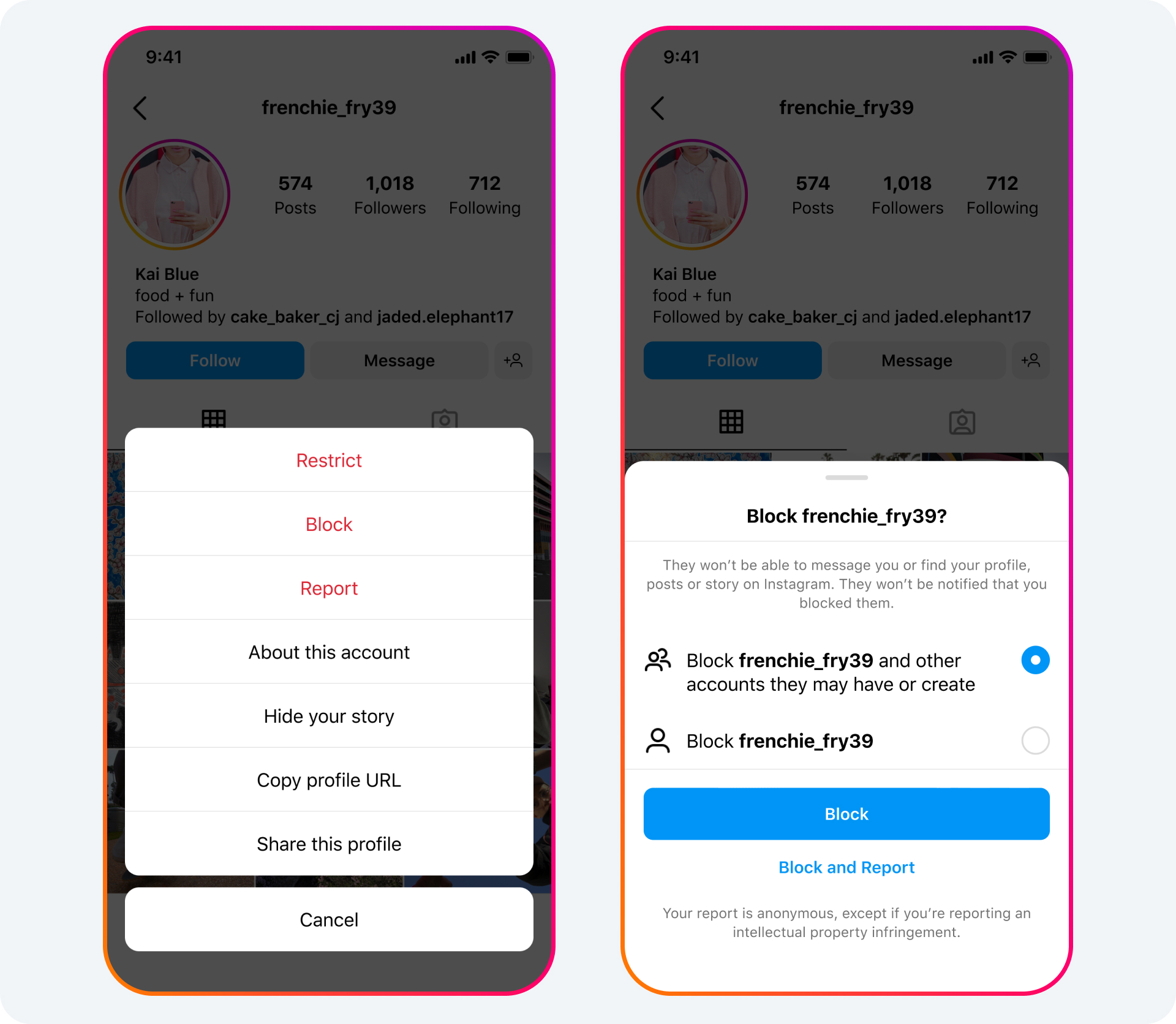 Blocking is a quick and effective way to stop someone from interacting with you. Now when you block someone on Instagram, you can also block any other accounts they may already have, or may create in the future, making it even harder for them to contact you.
