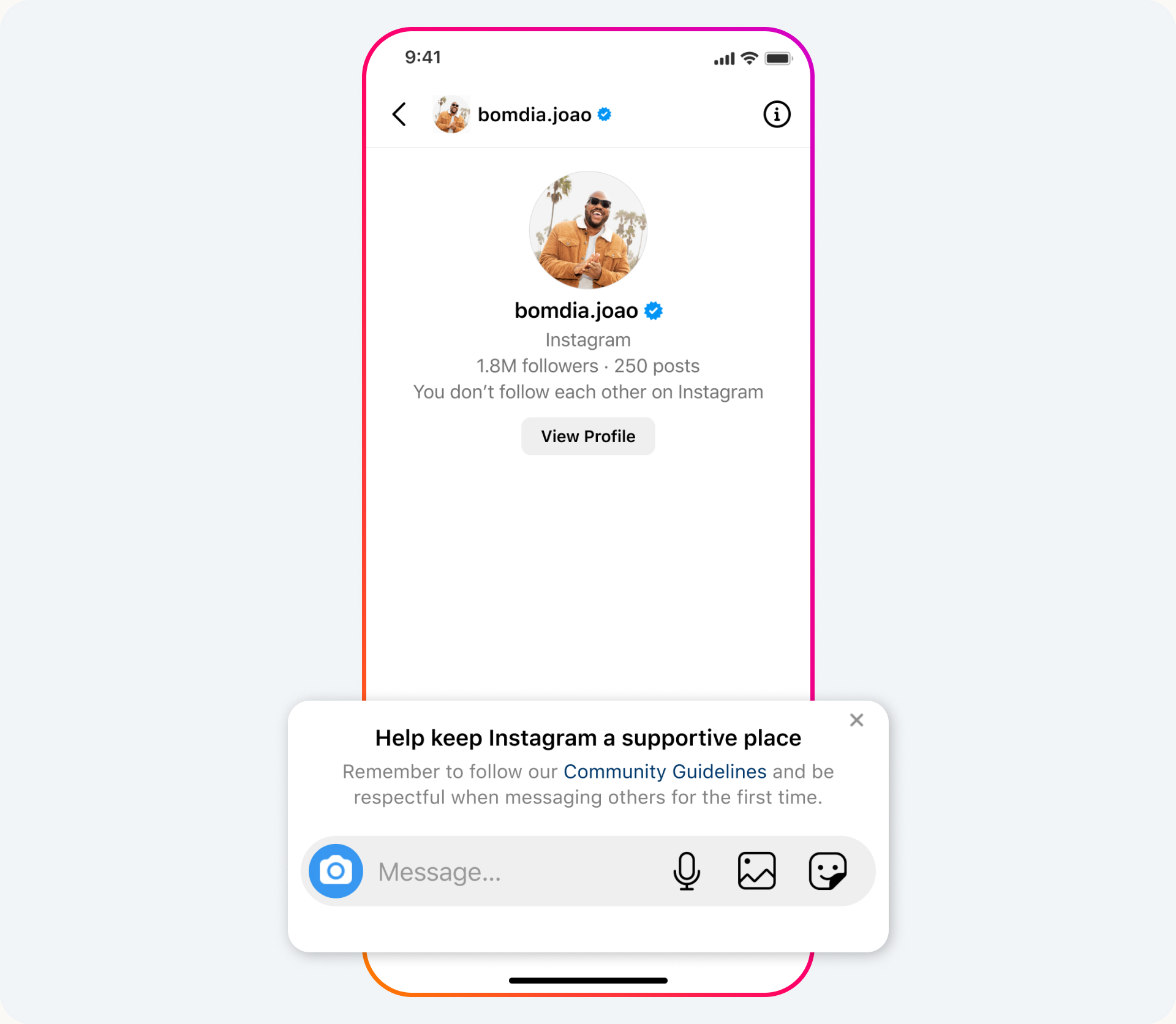 When people send a DM request to a creator or public figure for the first time, we’ll remind them to be respectful, so they remember there’s a real person on the other side of their message.