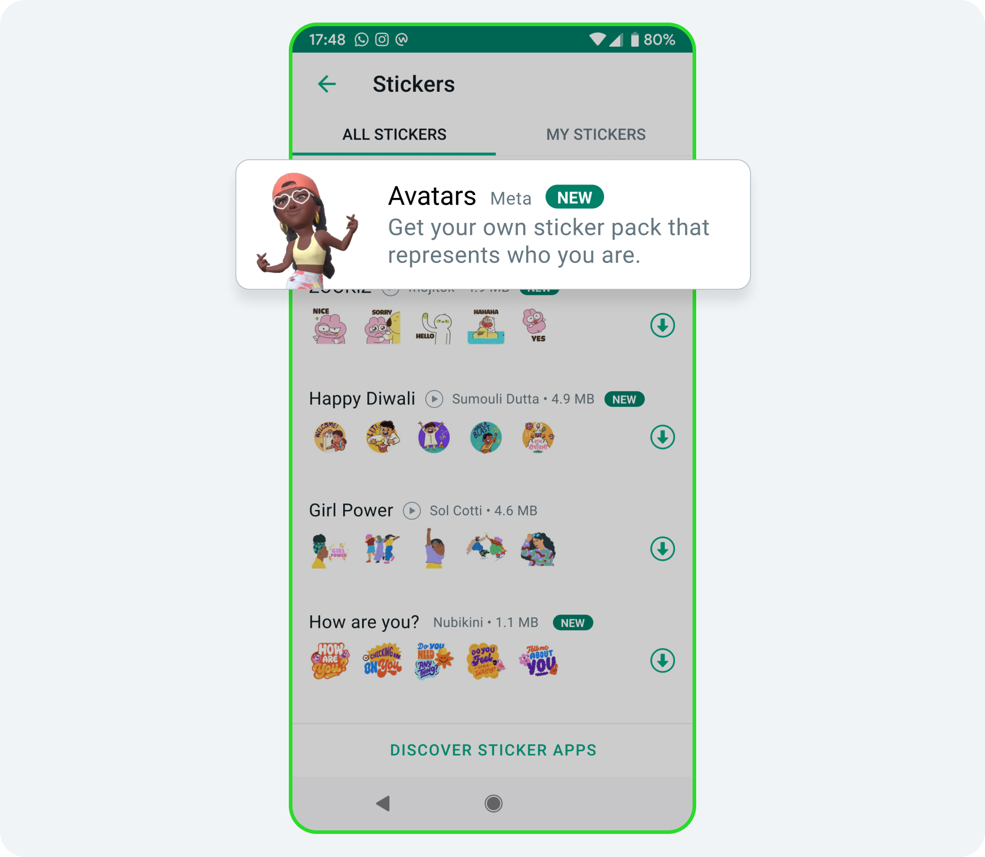 Your avatar is a digital version of you that can be created from billions of combinations of diverse hair styles, facial features and outfits. On WhatsApp, you can now use your personalized avatar as your profile photo or choose from 36 custom stickers reflecting many different emotions and actions.