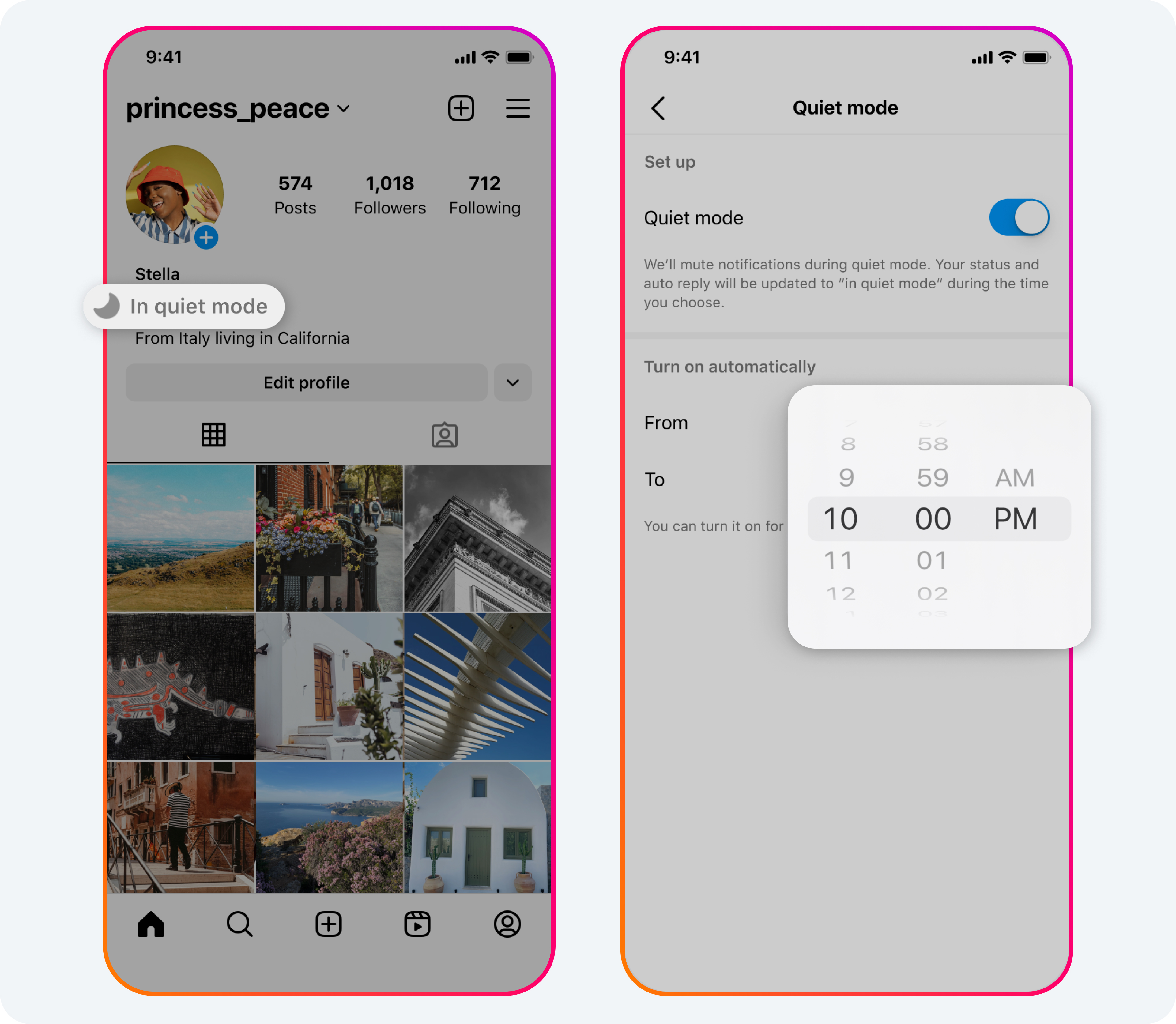 In January, we introduced Quiet Mode on Instagram, a new feature to help people focus and to encourage them to set boundaries with their friends and followers. For example, when you turn on Quiet Mode, you won’t receive any notifications, your profile’s activity status will change to let people know you’re in Quiet Mode, and we’ll automatically send an auto-reply when someone sends you a DM. We’re making Quiet Mode available to everyone on Instagram globally in the coming weeks.