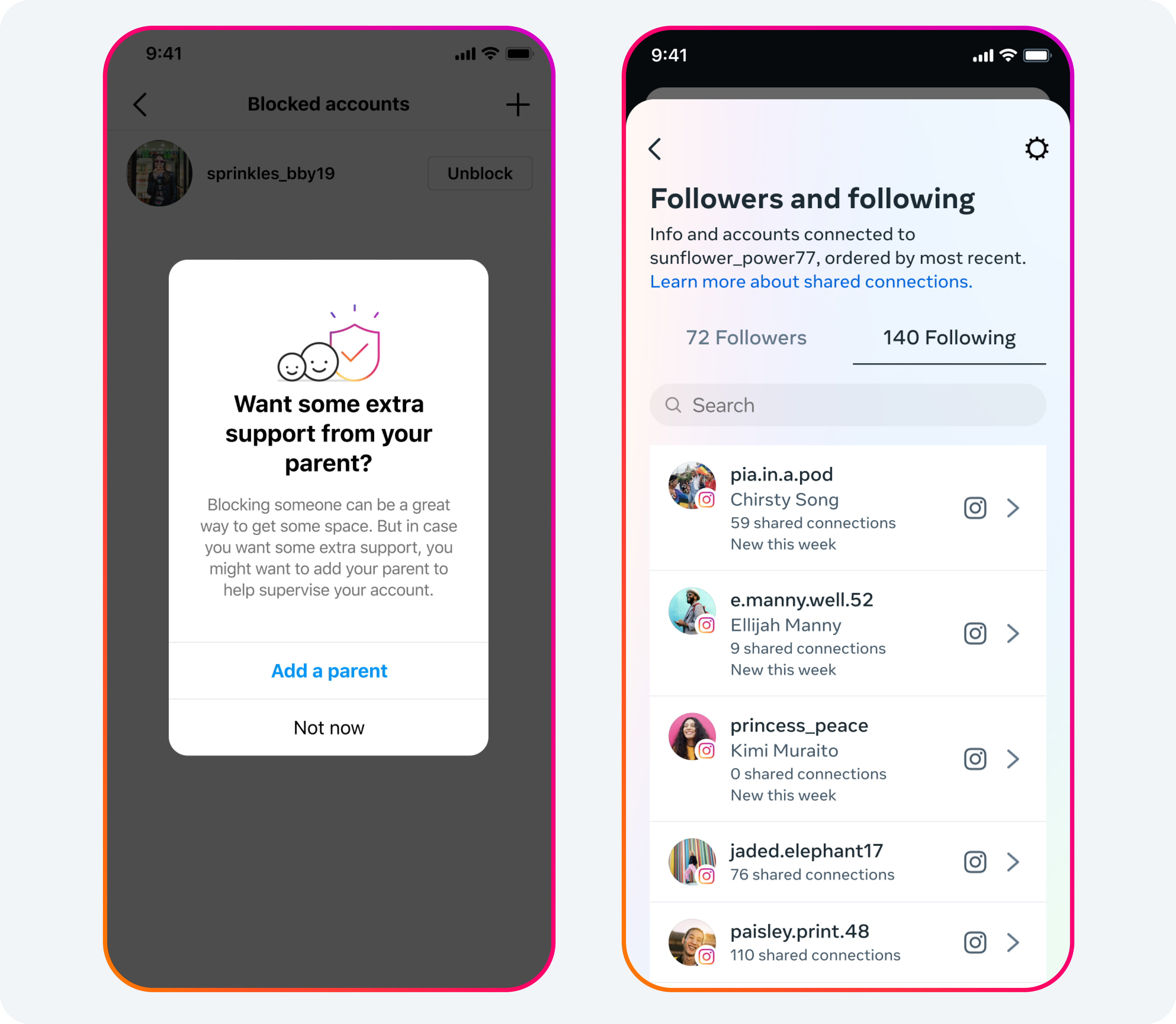 - In addition to seeing which accounts their teen follows and is followed by, parents will now be able to see how many friends their teen has in common with those accounts. This will help parents understand how well their teen knows these accounts, and help prompt offline conversations about those connections.
