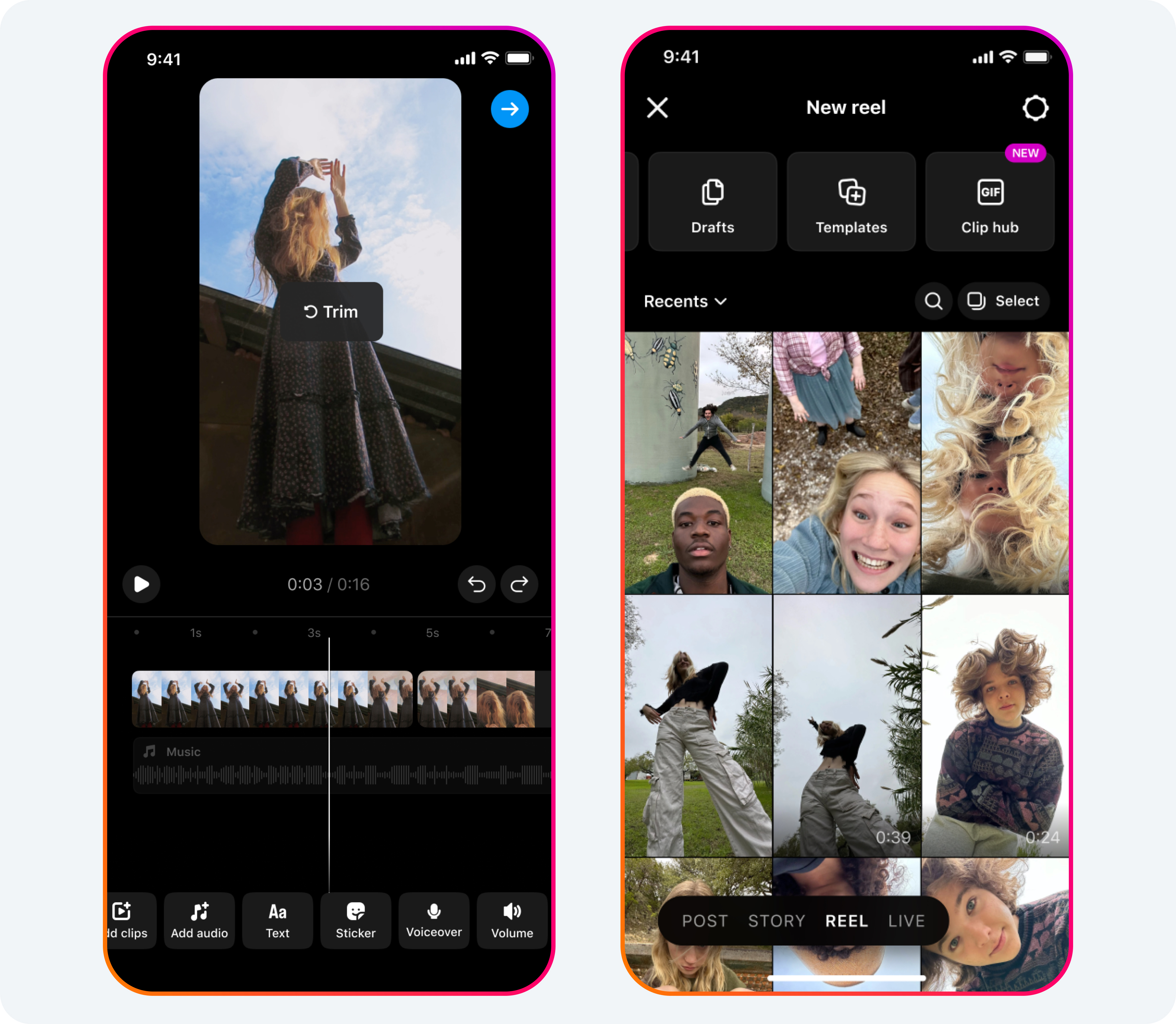 • Make new memes by adding clips with audio to your reels from our new media clip hub