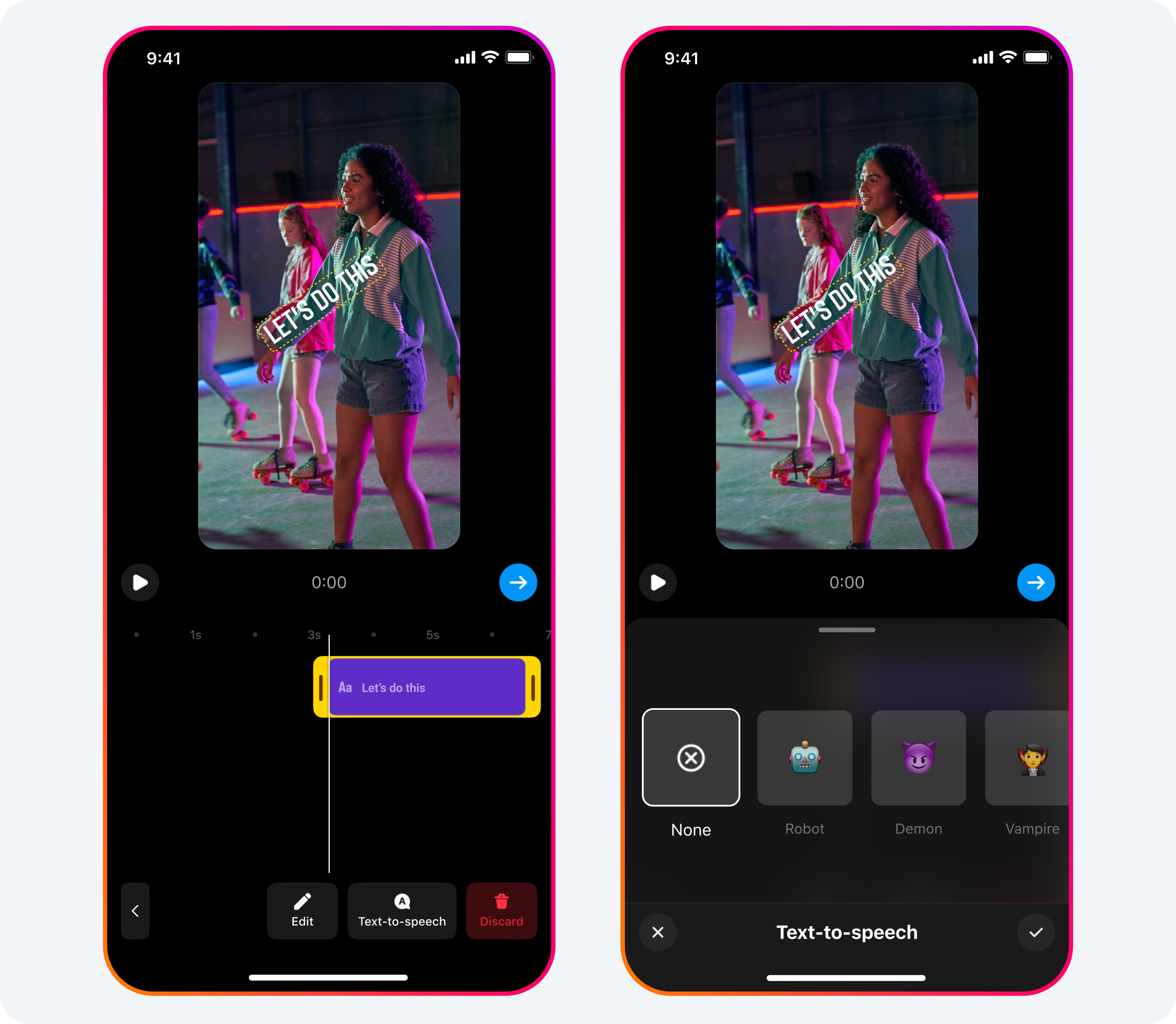 We’re also adding 10 new English text-to-speech voices to choose from, available in select countries. Flex your creativity with six new text fonts and styles available in hundreds of languages. To help your text stand out even more, you can also add outlines for better clarity.
