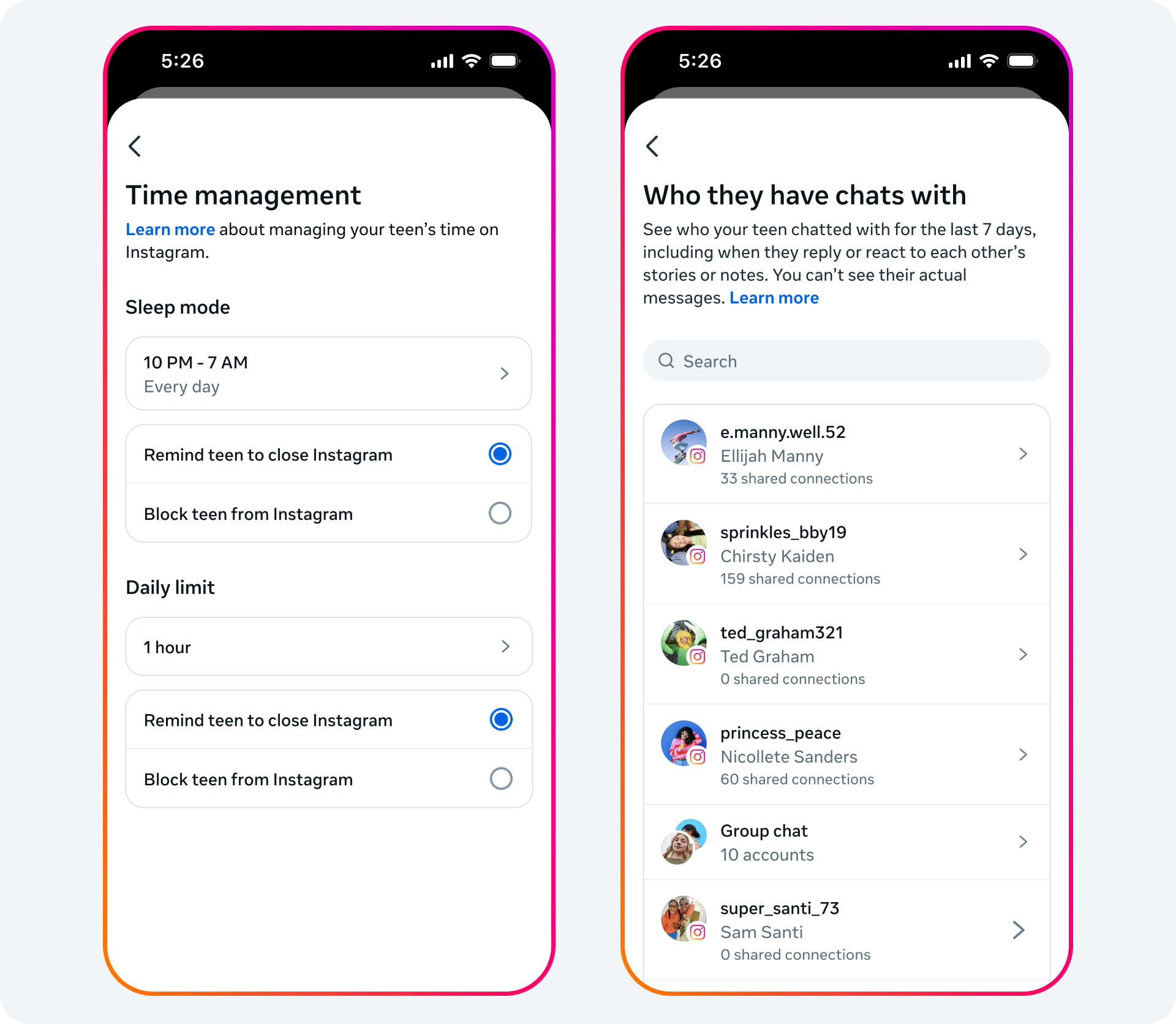 - Set total daily time limits for teens’ Instagram usage: Parents can decide how much time their teen can spend on Instagram each day. Once a teen hits that limit, they’ll no longer be able to access the app.
