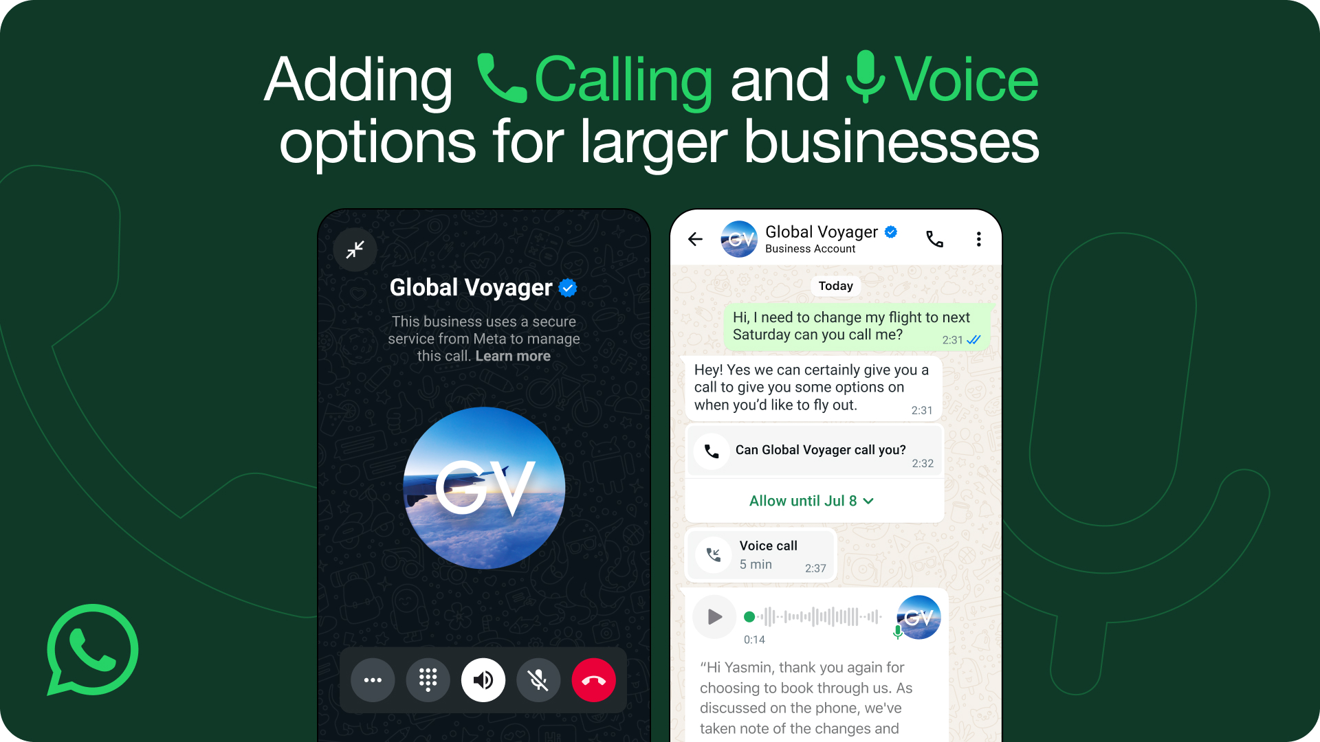 There also might be times it’s helpful to provide additional support to customers beyond just a text. In the coming weeks, larger businesses using the WhatsApp Business Platform will be able to receive a call from a customer when they want to talk to someone live, or call a customer directly once they’ve asked to hear from you. And starting soon, we’ll also make it possible to send and receive voice messages for additional support, or make a video call which can be helpful for things like a telehealth appointment. Bringing calling and voice updates to the WhatsApp Business Platform will help people communicate in a way that works best for them and paves the way for AI-enabled voice support in the future. Businesses interested in getting started with calling on the WhatsApp Business Platform can work with one of our partners.